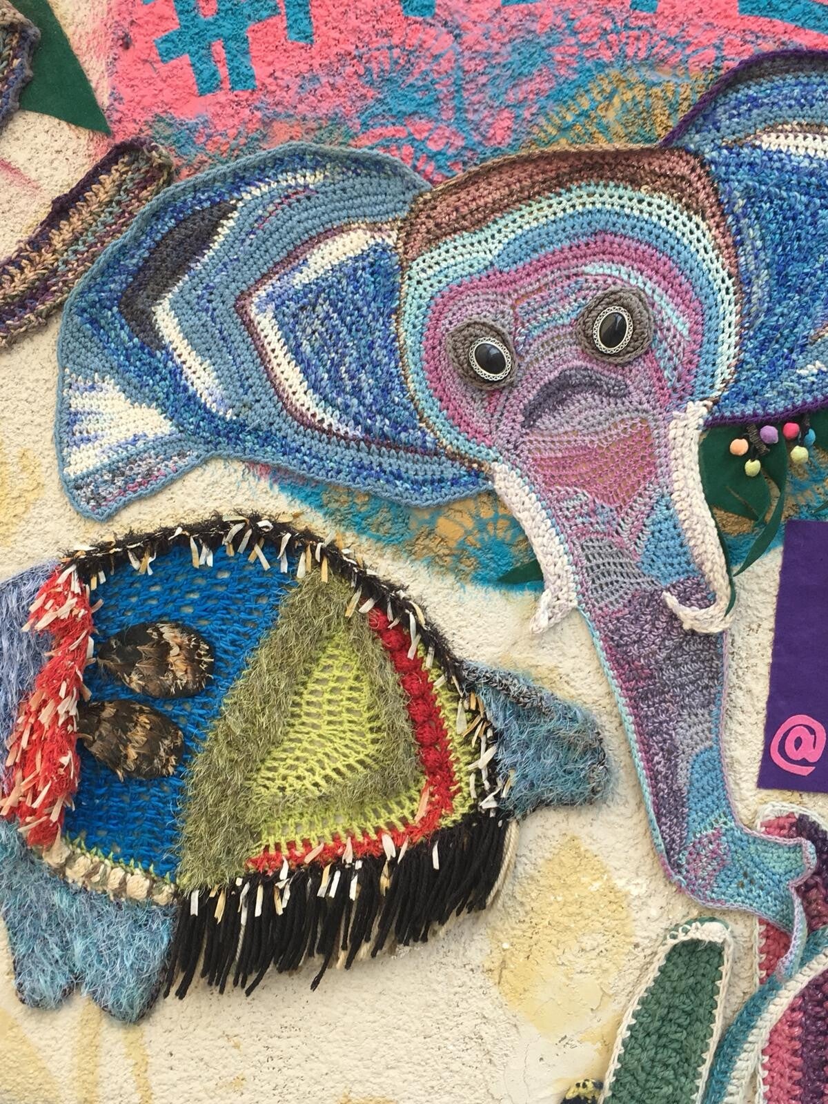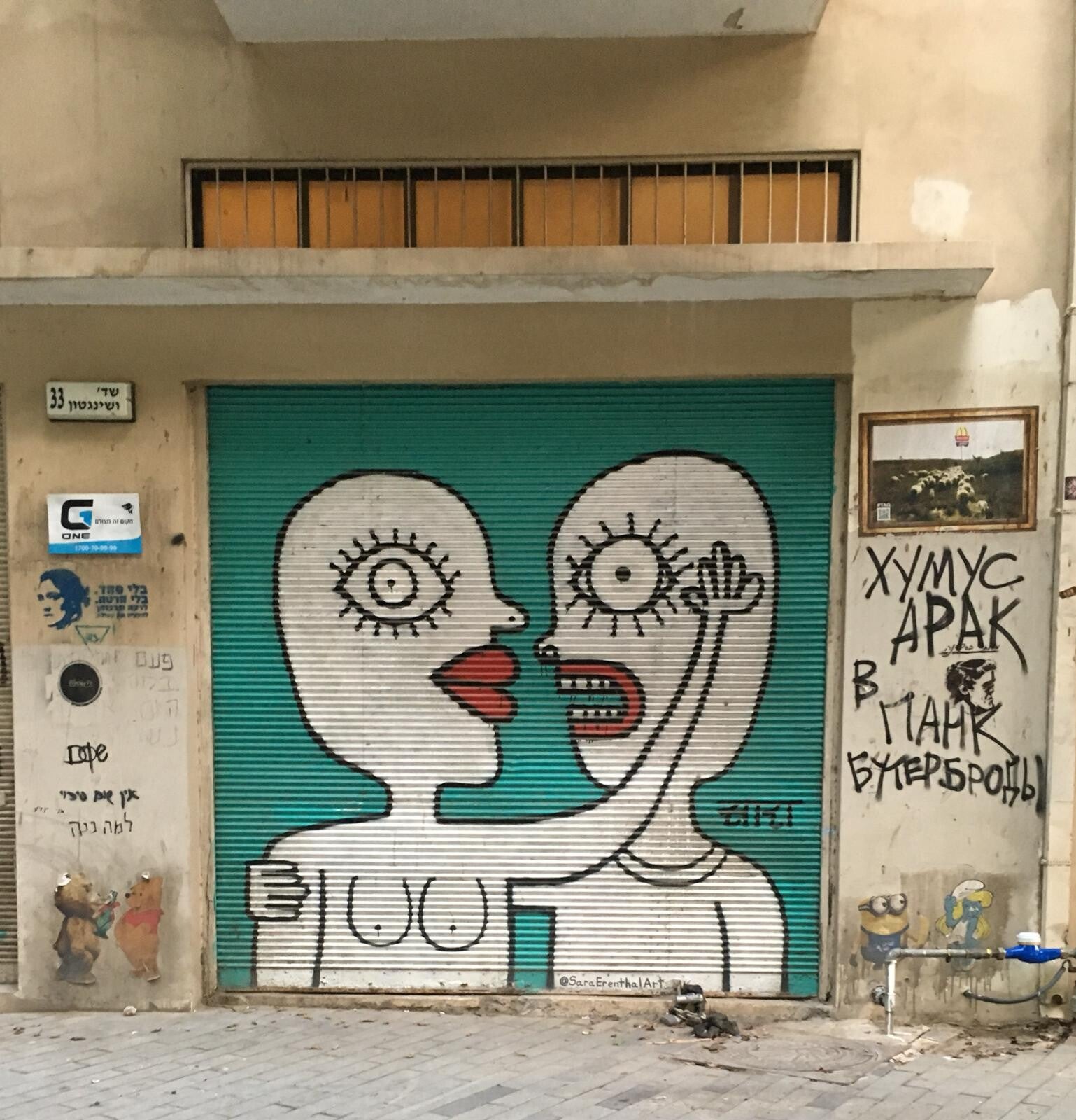 Deze afbeelding toont een voorbeeld van straatkunst of graffiti op deuren en muren.